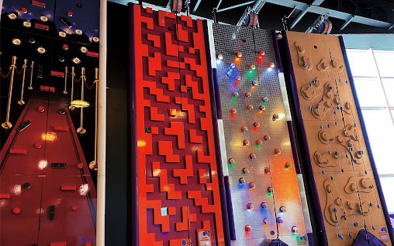 Climbing Wall Zone – a vertical challenge for competitive climbers with safety mats below.