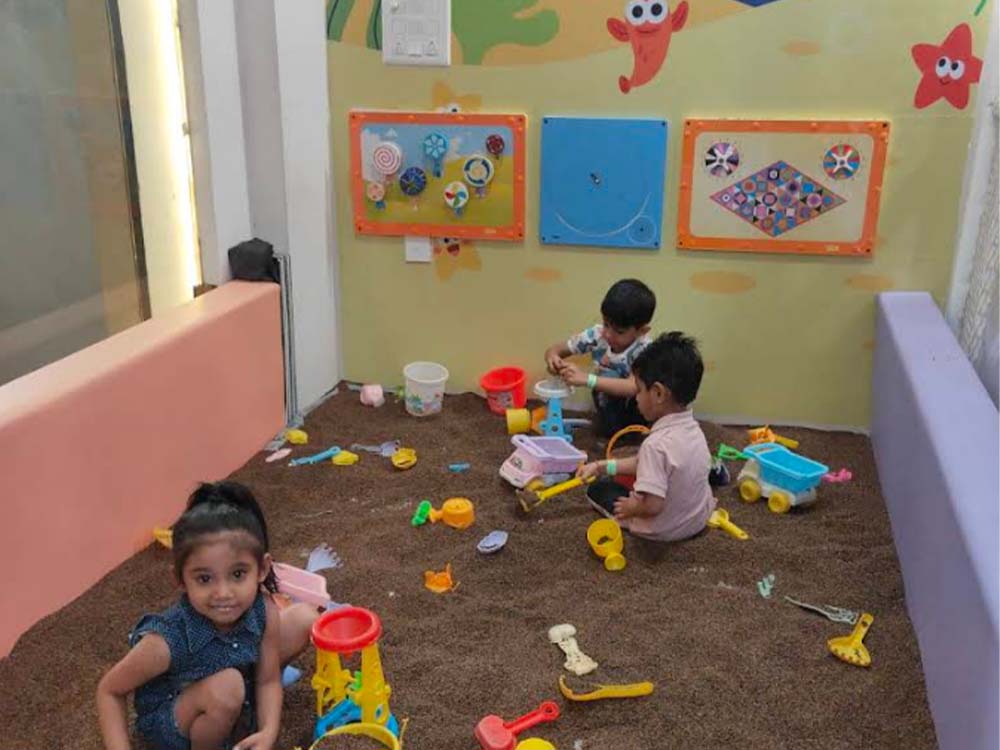An indoor sand play zone using safe, non-toxic materials, suitable for sensory development and free play.